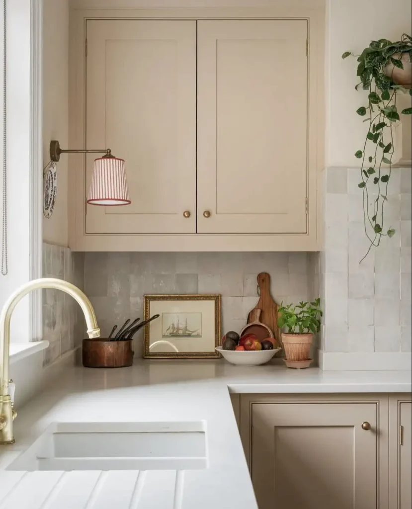 یک کابینت کرمی کنار یک شید راهراه کوچک، حس یک خانه روستایی انگلیسی میدهد. شیر دیواری برنجی، تابلوهایی که راحت روی کانتر تکیه دادهاند، و گلدانهای کوچک سبزی… همه چیز انگار کمکم و با زمان جمع شده.