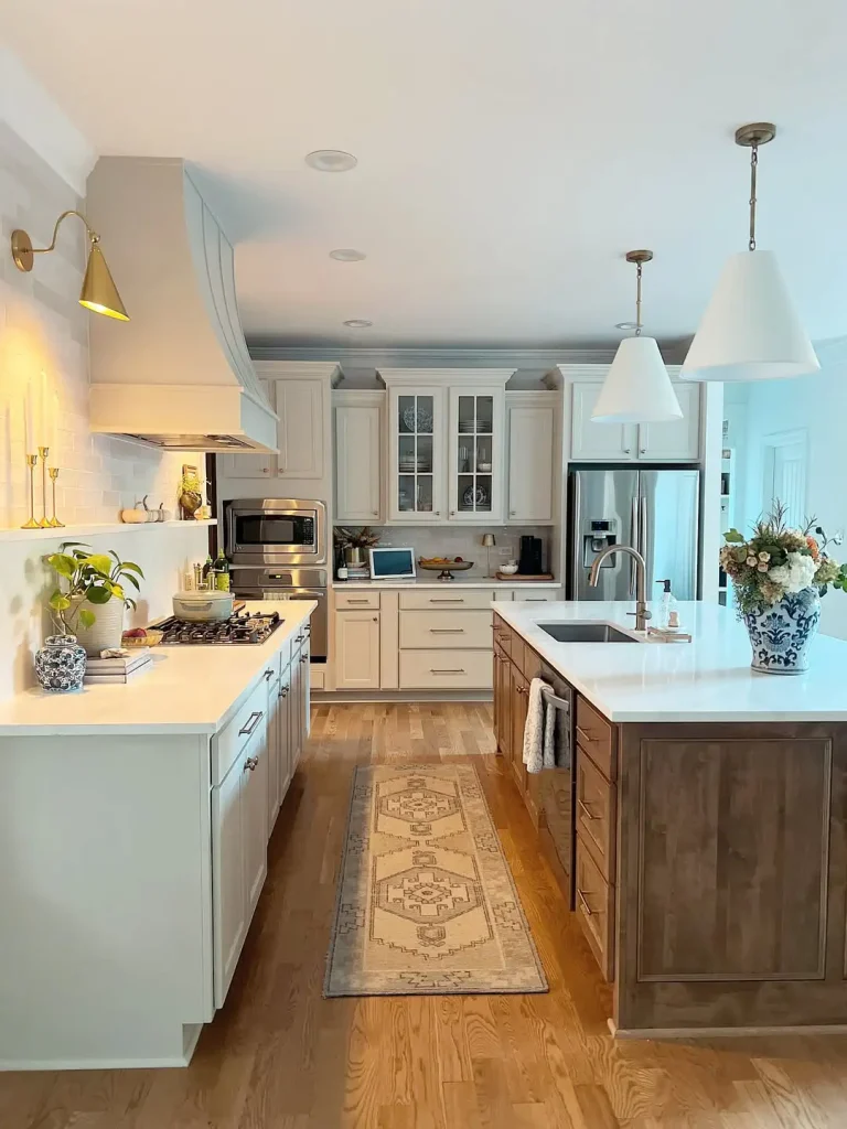 کابینتهای کرمی، یک گرمای ثابت دور فضا میسازند و جزیره چوبی کمی بافت روستایی اضافه میکند. هود با انحنای نرم و جزئیات برنجی، مرتب و خوشدوخت است، نه مد روزِ زودگذر. یک قالیچه طرحدار هم روی کف، حس زندگی و اصالت میدهد.