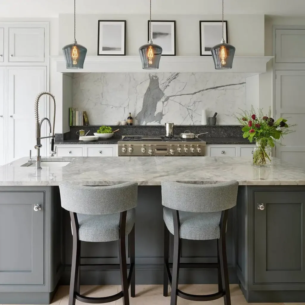 اینجا دیوارپوش مرمر نقش اول را میگیرد، آن هم بهترین جور. رگههای مرمر مثل یک تابلو روی دیوار کشیده شده و کابینتهای خاکستری روشن و سفید، آن را قاب کردهاند. چراغهای شیشهای با لامپهای فیلامنتی هم یک اشاره مدرن میدهند بدون اینکه آرامش فضا را بهم بزنند.