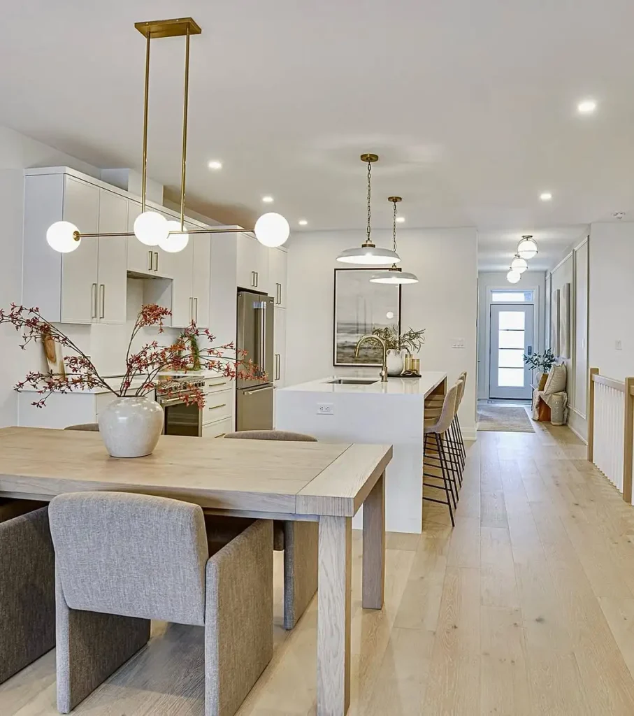 چراغهای فانوسی طلاییِ بزرگ در آشپزخانه سفید، یک حس ماندگار و کلاسیک میدهند. مثل یک قاب معماری بالای جزیره میایستند و نور گرم را روی صفحه مرمر و کابینتهای مرتب پخش میکنند. حتی تقارنشان هم آدم را راضی میکند.