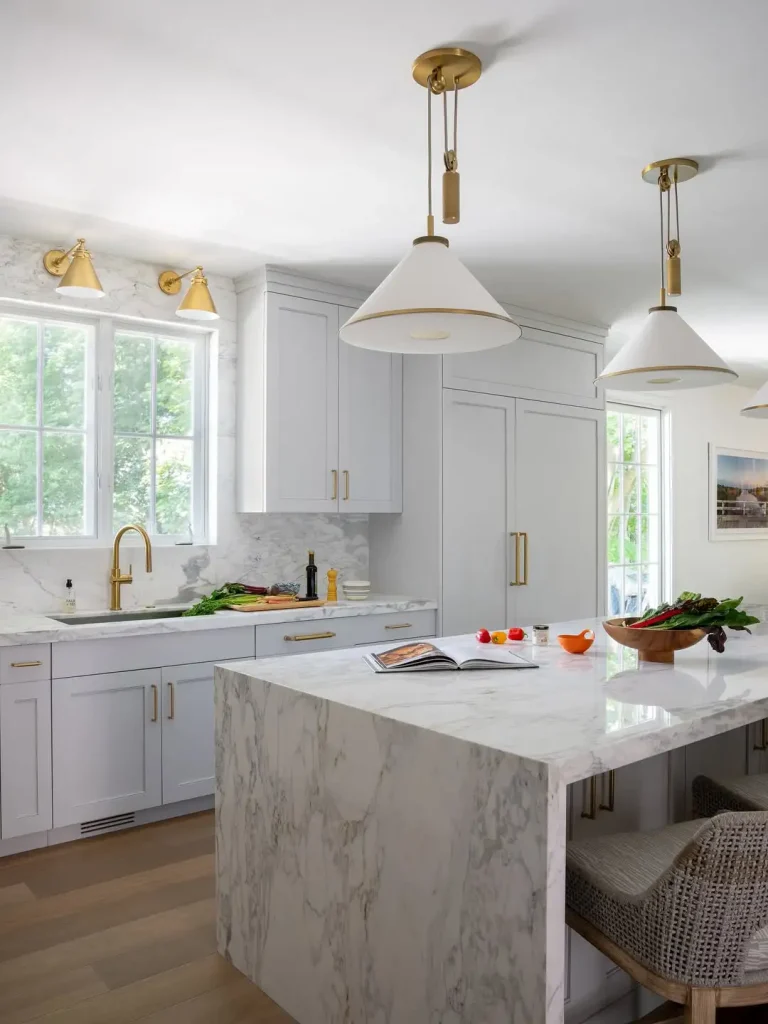 مرمر با رگههای بولد کنار حبابهای سفیدِ بزرگ، نتیجهاش یک «نمایش حسابشده» است. فرم چراغها ساده است، اما اندازهشان تاثیر میگذارد؛ مخصوصاً بالای جزیره آبشاری.