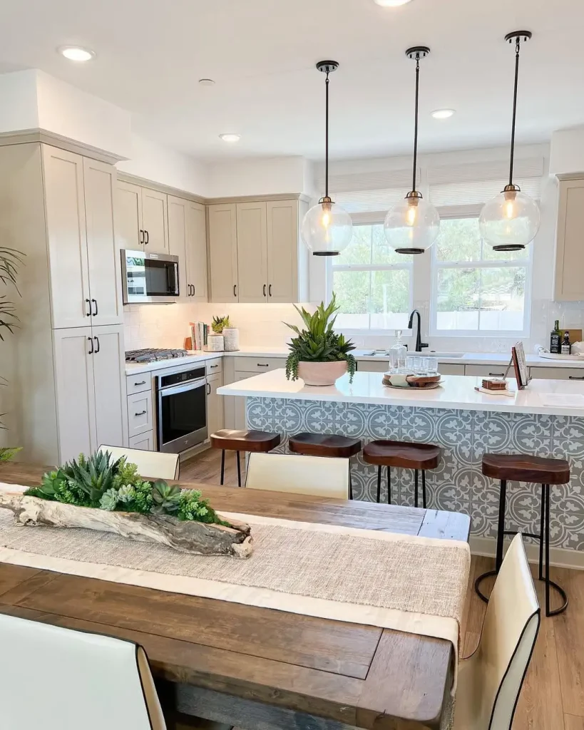 این مدل چیدمان آدم را دعوت میکند کنار جزیره بنشیند، یک دستور غذا ورق بزند و زندگی جریان داشته باشد. کاربردی است، اما پر از شخصیت؛ یادآوری اینکه «فضای ذخیرهسازی» هم میتواند زیبا باشد وقتی داستان شما را نشان بدهد.