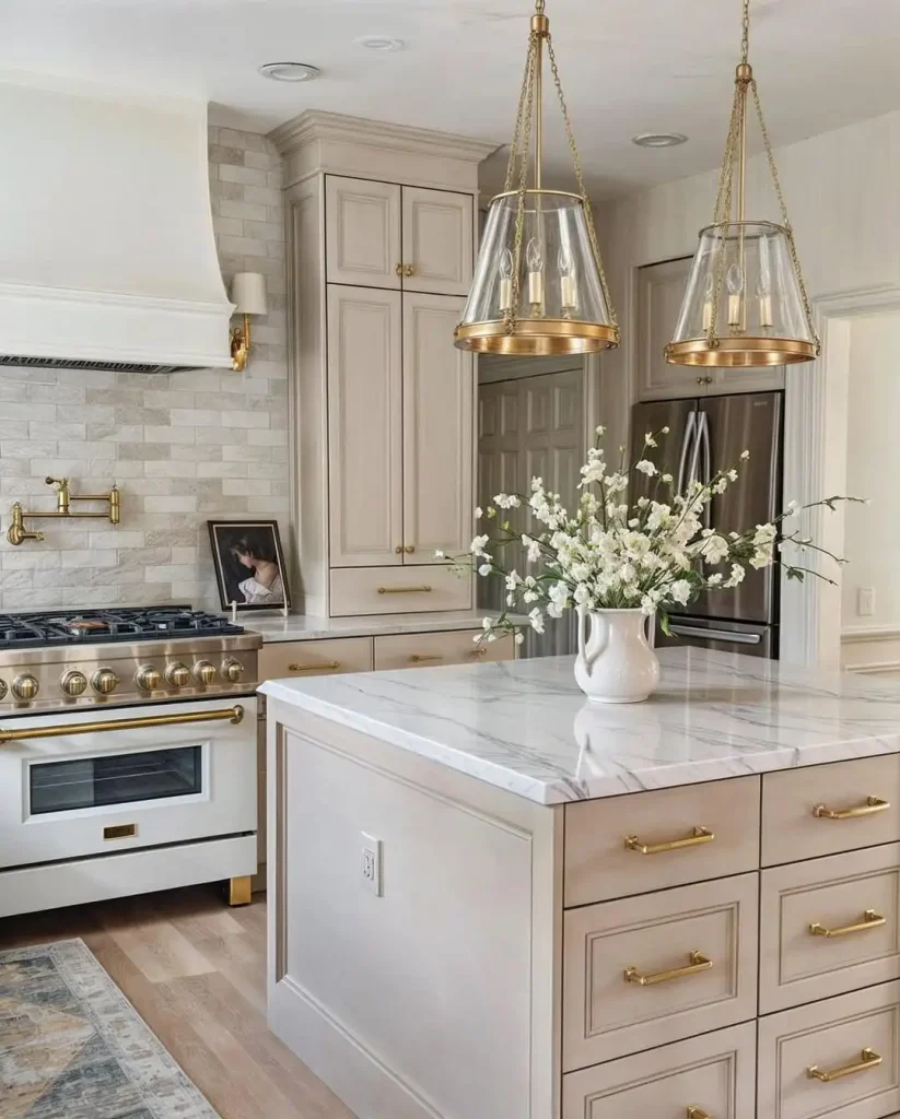 این آشپزخانه انگار همیشه آمادهی یک مهمانی شام است. چراغهای آویز شیشهایِ بزرگ با حاشیهی برنجی گرم، بالای جزیره مثل جواهر معلقاند و نور را روی کابینتهای کرمی و سطحهای مرمری پخش میکنند. فرم چراغها حس کلاسیک دارد، اما اندازهشان آنقدر درست انتخاب شده که کاملاً امروزی به نظر میآید.