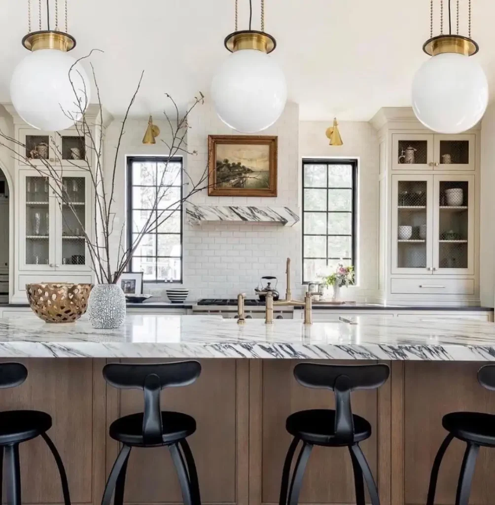 خطوط تمیز، دیوارهای مرمر و حبابهایی که مثل قطعههای هنری معلقاند. این آشپزخانه مینیمال است، اما یراق برنجی نمیگذارد خشک و بیمارستانی شود. معماریگونه و دقیق است، اما گرم میماند.
