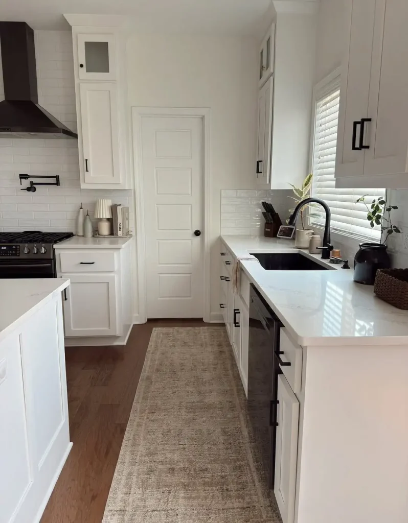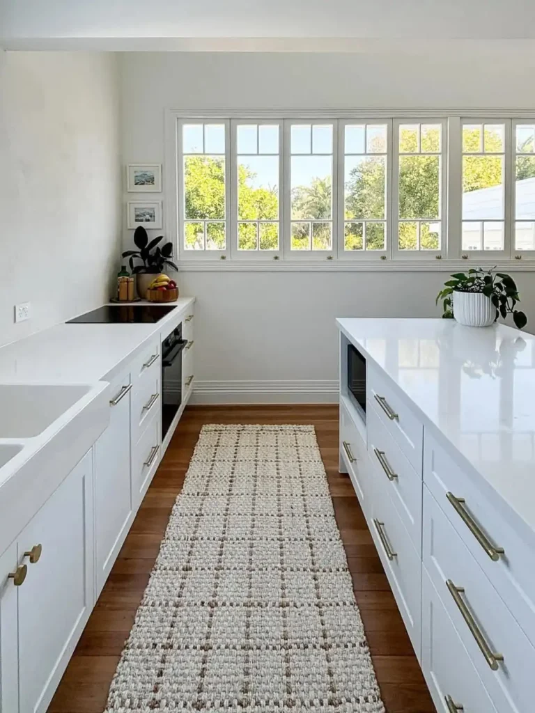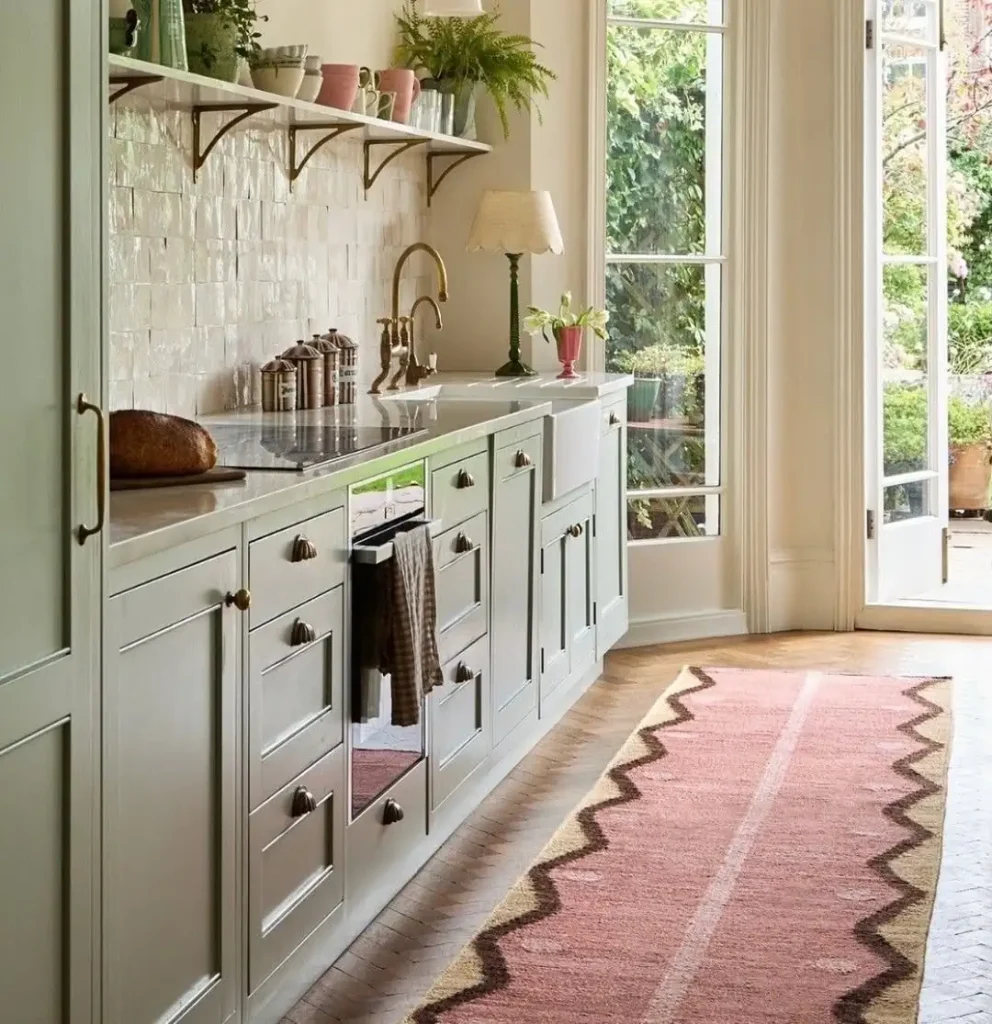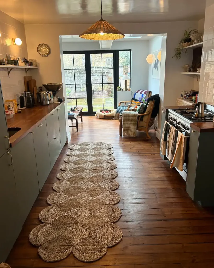 این رانر زیر پا یک گرما و “ریتم” میده که با متریالهای طبیعی داخل آشپزخونه هماهنگه. حسش اینه که فضا با زمان شکل گرفته، نه یکشبه.