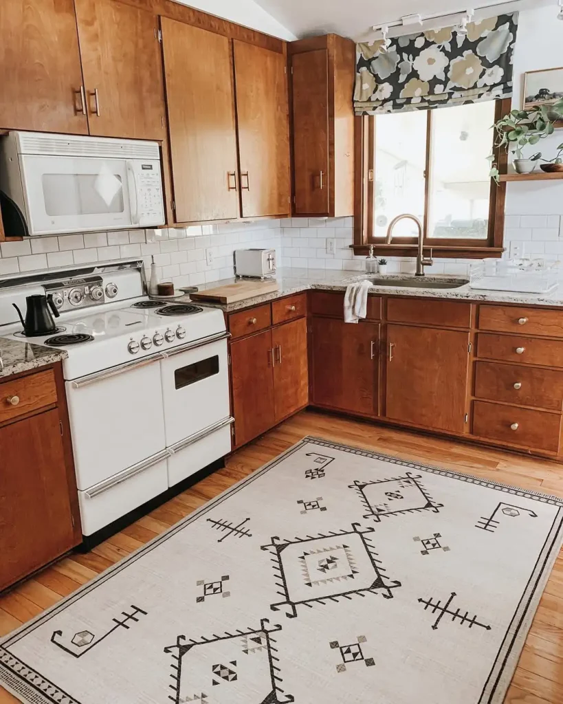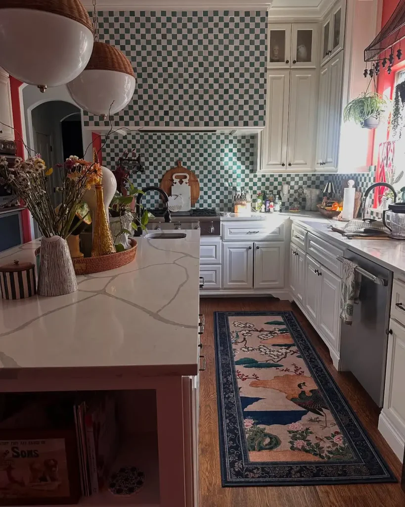 یادآوری خوبیه که آشپزخونه همیشه لازم نیست محافظهکار باشه. گاهی یک فرش با اعتمادبهنفس، حال و هوای کل فضا رو میسازه.