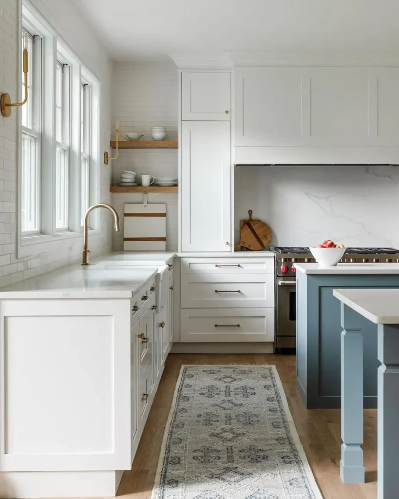 ۲) آبی ملایمِ کلاسیک برای آشپزخونههای سفید