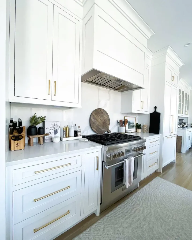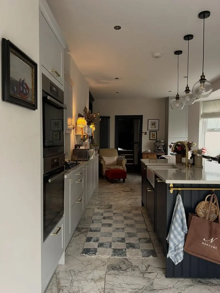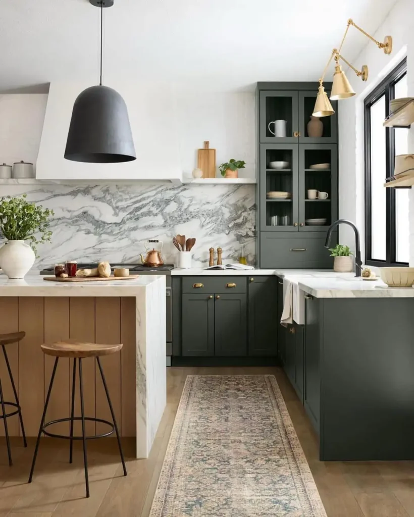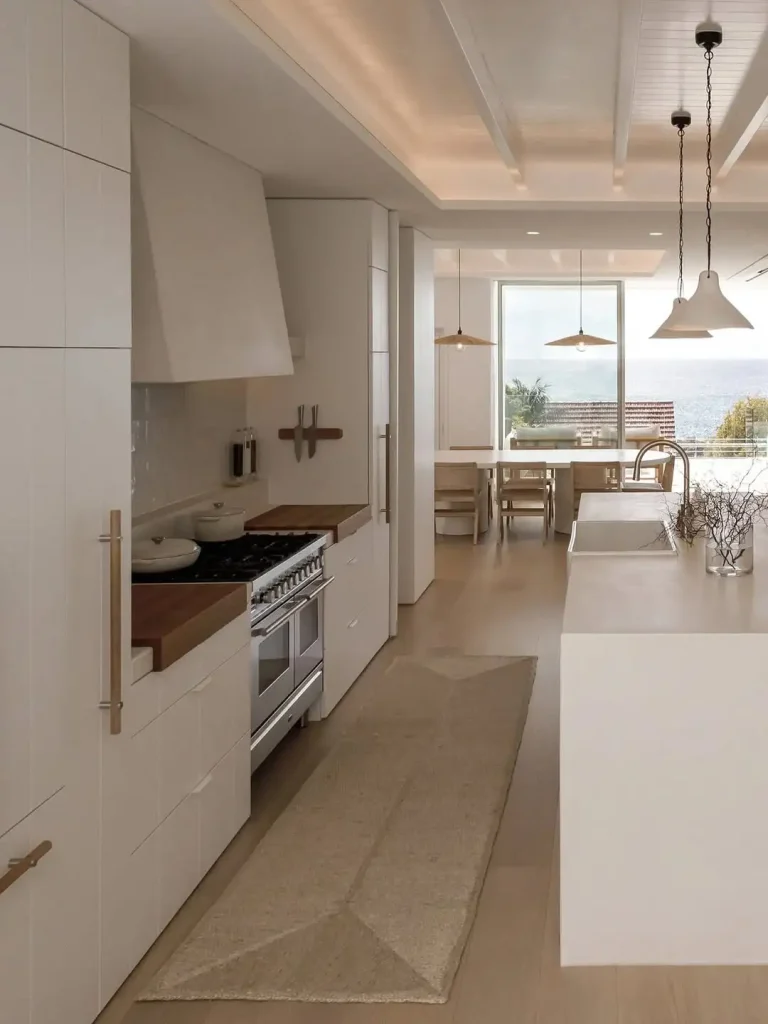 همهچیز حسابشده چیده شده: جزئیات برنجی، و رانری که نگاه رو در طول آشپزخونه میکشه و فضا رو کشیدهتر نشون میده. طرحش عمق میده، ولی آرامش رنگها رو به هم نمیزنه.