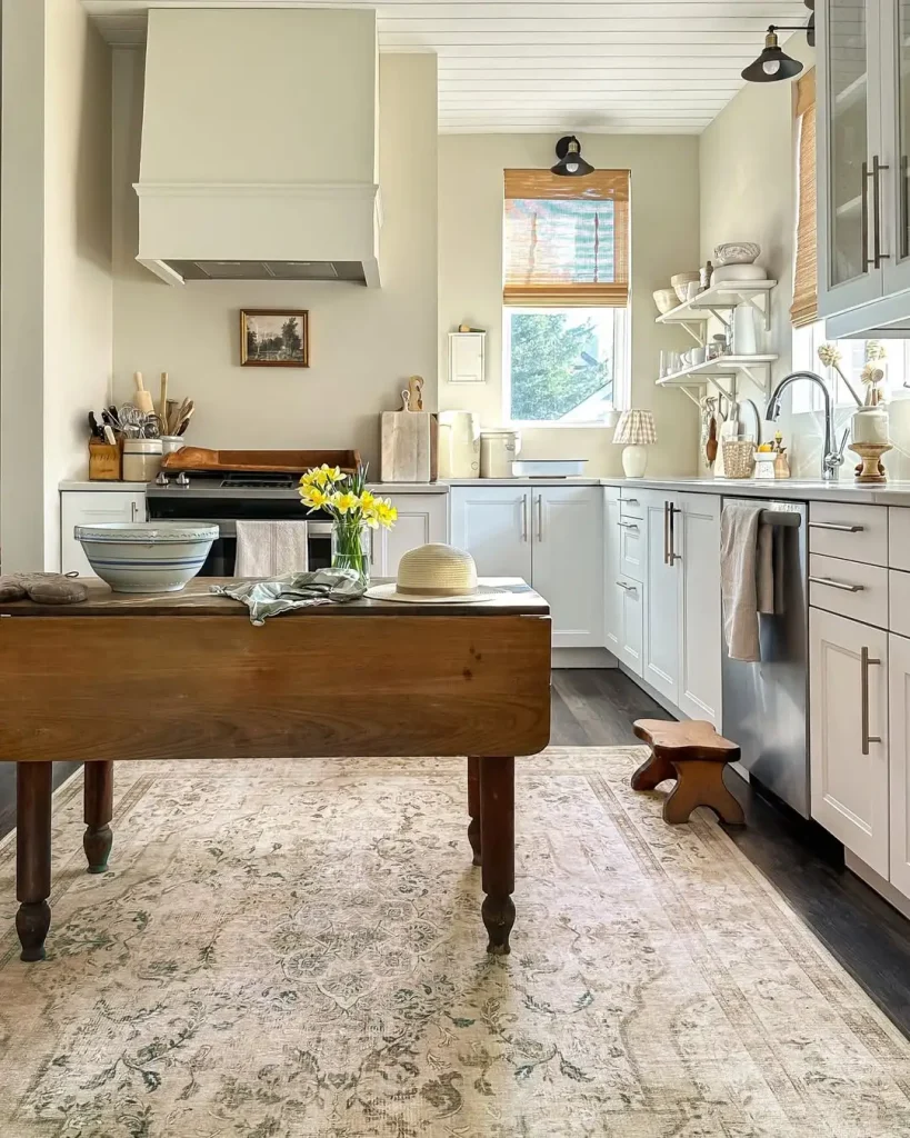 این فرش همهچیز رو دوباره بالانس میکنه: طرح سنتی، رنگهای خنثی و اندازهای که دقیقاً به آشپزخونه میاد. هیچ چیزی توش اغراق نشده و همین جذابش میکنه.