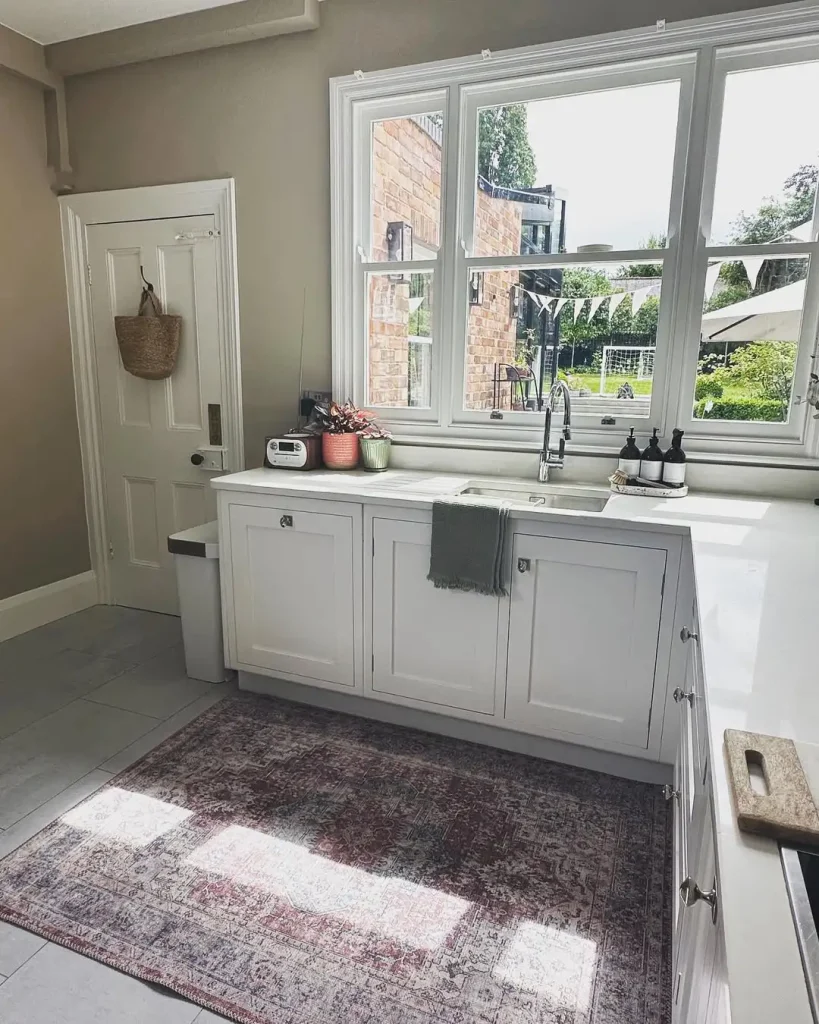 این قالیچه نور رو خیلی قشنگ میگیره. طرحش محوه اما نه خسته و فرسوده. یک لایه راحتی میده که باعث میشه جلوی سینک جایی باشه که یک کم مکث میکنی، نه فقط رد میشی.