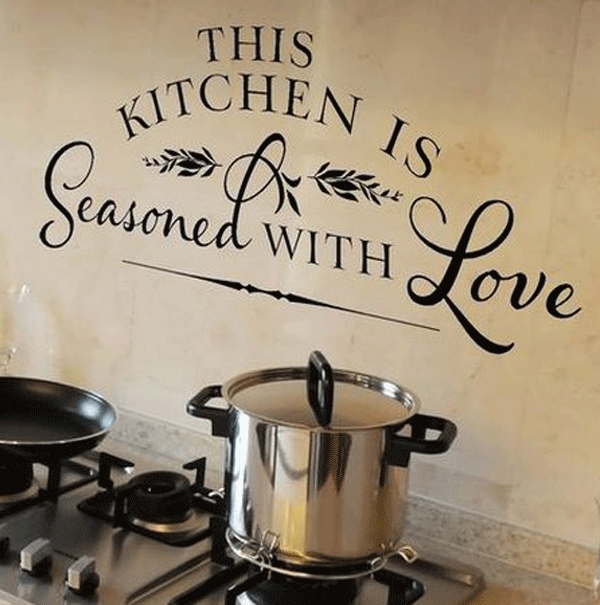 متن و کلمات الهامبخش: یک برچسب دیواری با متن الهامبخش و مثبت میتواند یک ایمان به خود، انرژی و خلاقیت را در آشپزخانه شما ایجاد کند. میتوانید از جملات مانند “Cook with Love” (با عشق آشپزی کنید)، “Eat Well, Laugh Often, Love Much” (خوب غذا بخورید، زیاد خندید، زیاد دوست داشته باشید) و یا “This Kitchen is Seasoned with Love” (این آشپزخانه با عشق مزه دار شده است) استفاده کنید.