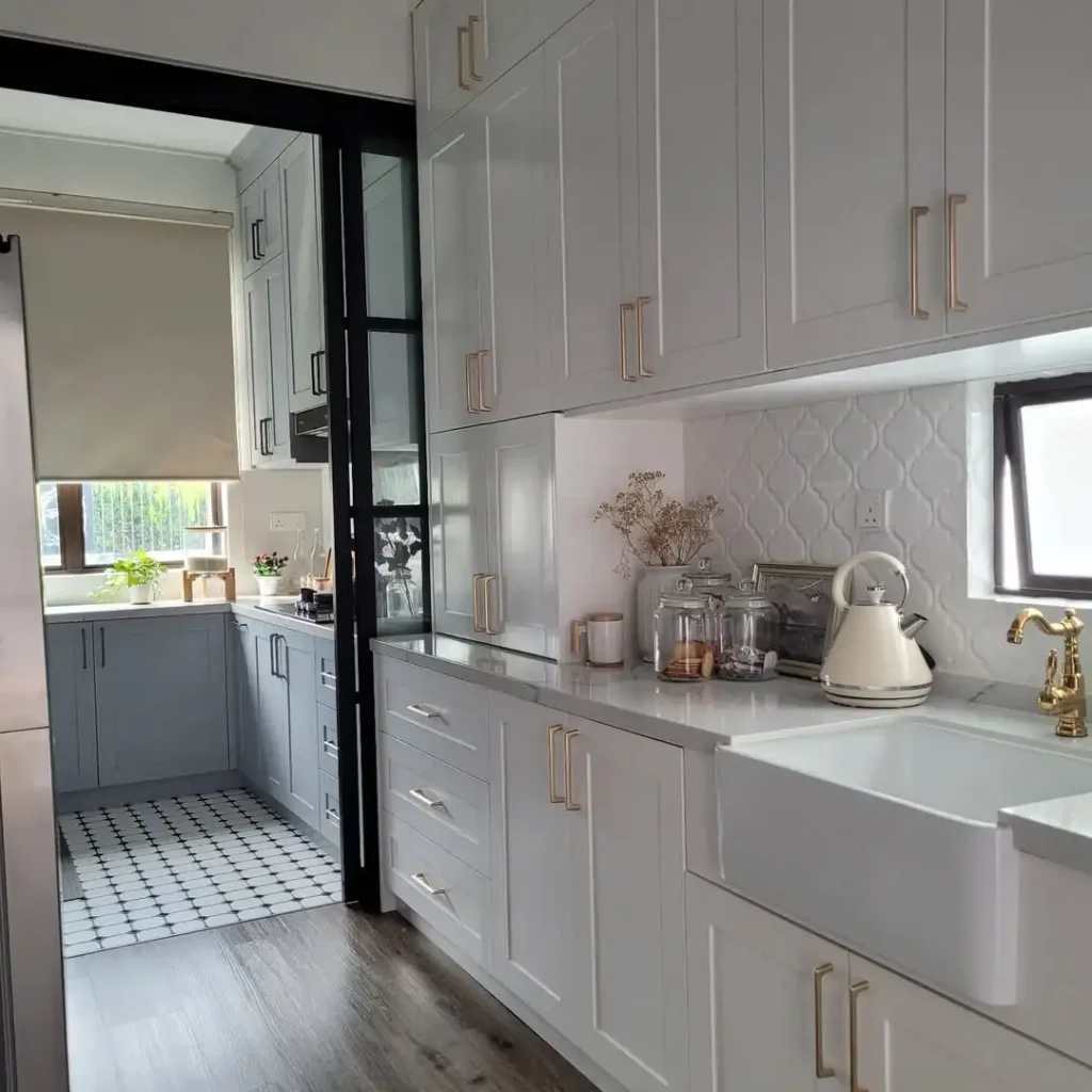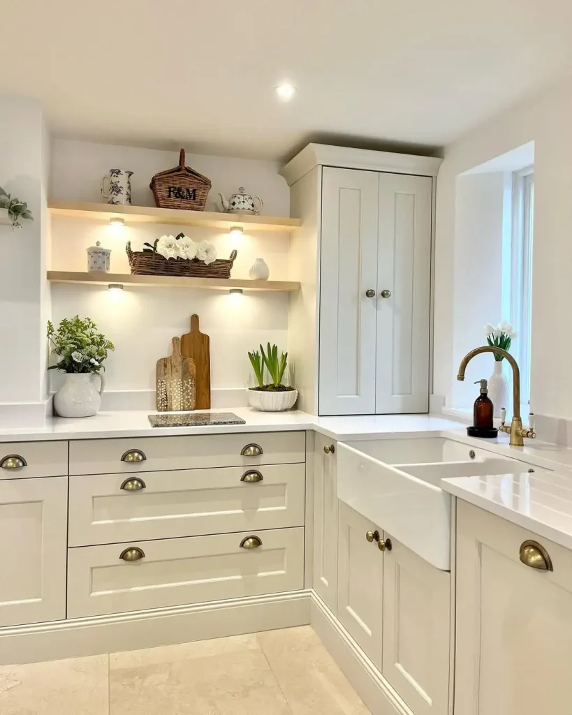 این چیدمان اون مدل رضایتبخشهاست. کابینت سفید، یک بکاسپلش با نقش خیلی ملایم، و طاقچهای که سبک چیده شده: شیشهجارهای مرتب، چند تا جزئیات نرم، و تمام.