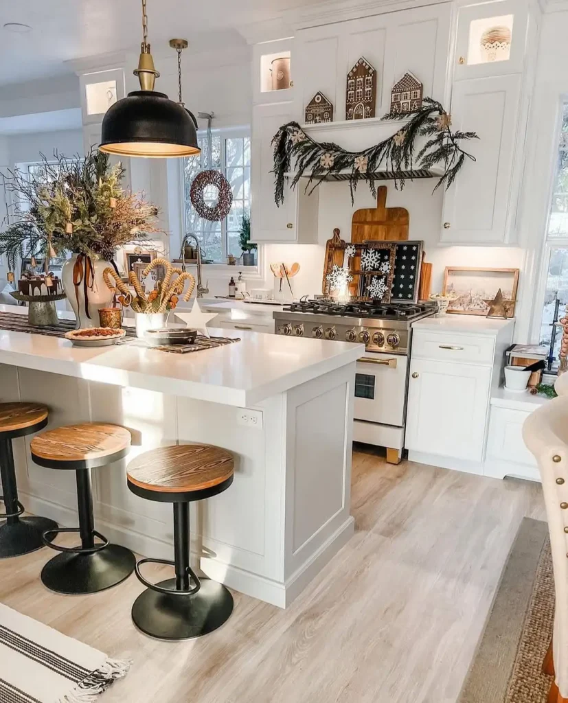 خطوط تمیز، کابینت کرمی، و فقط یک اشارهی کوچیک به دکور فصل. مثلاً چند تا آیتم فصلی روی طاقچه که «نزدیکترین حالت به کمترین شلوغی» را دارد. این مدل چیدمان بهجای اینکه آشپزخانه را پر کند، فقط حسش را تغییر میدهد.