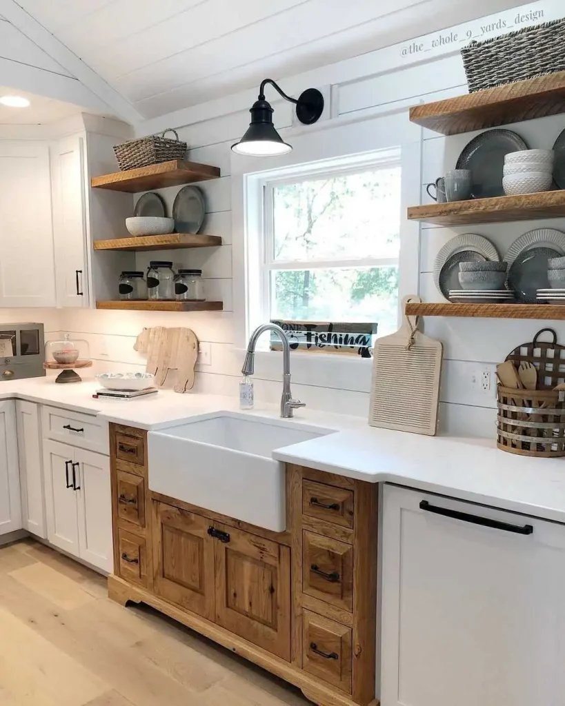 این یکی بیشتر سمت سنتی میره: کف چوبی گرم، شلفهای باز، و سینک درست زیر پنجره. طاقچه هم خیلی ساده میمونه و اجازه میده شلفها و جزئیات اطراف بیشتر دیده بشن.