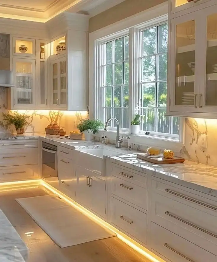 اینجا همهچیز حول «نور» میچرخه. نور مخفی زیر کابینت، درهای شیشهای، و یک بکاسپلش سنگی یکدست که فضا رو خیلی مرتب و باکلاس نشون میده. نور طبیعی پنجره هم این حس رو چند برابر میکنه.