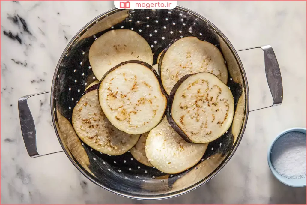 - بگذارید به مدت ۲۰ تا ۳۰ دقیقه در یک صافی بمانند تا آب اضافی و تلخی آنها خارج شود.