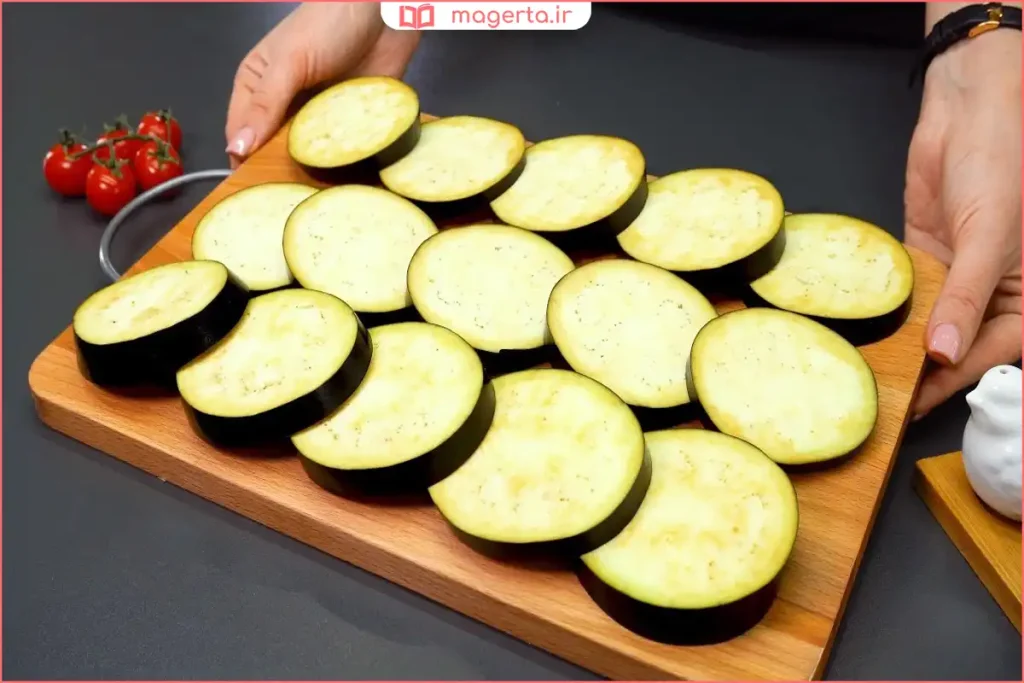 - نکته: این روش باعث میشود بادمجان در هنگام سرخ کردن کمتر روغن جذب کند و تردتر بماند.