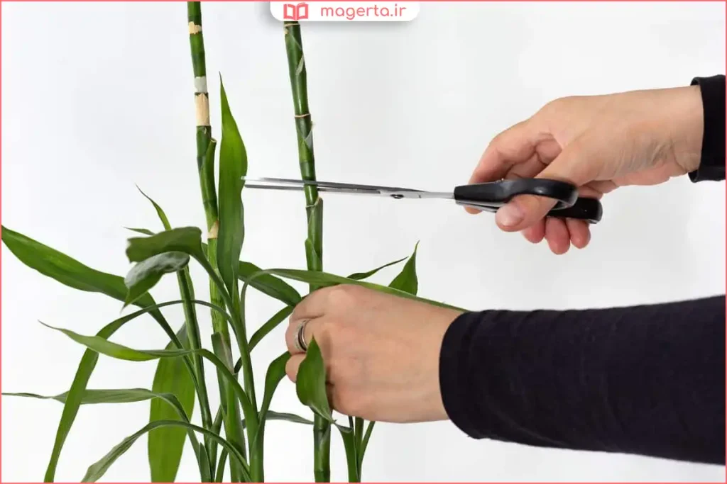 برای اینکه بامبو همیشه تمیز و مرتب به نظر برسد، بهتر است بهصورت دورهای برگها و ساقهها را بررسی کنید و برگهای زرد و قهوهای را با قیچی تمیز از نزدیکترین نقطه به ساقه جدا کنید. این کار هم ظاهر گیاه را بهتر میکند و هم از گسترش احتمالی بیماری یا پوسیدگی جلوگیری میکند.
