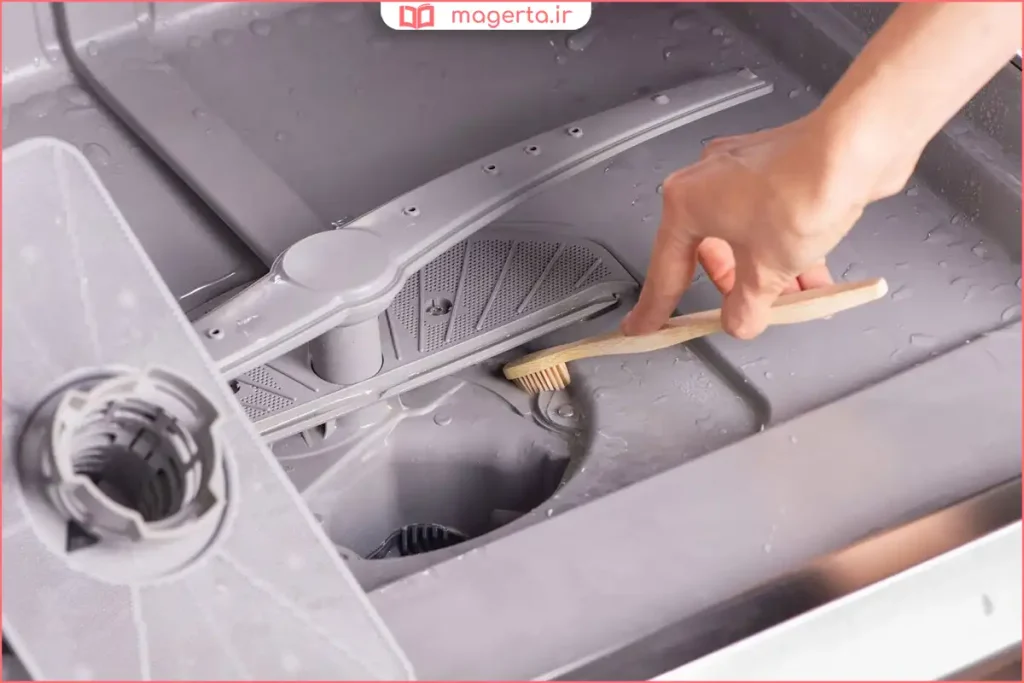 - بازوهای اسپری: منافذ بازوهای اسپری ممکن است با ذرات غذا مسدود شوند. آنها را خارج کرده و با یک خلال دندان یا سوزن تمیز کنید.