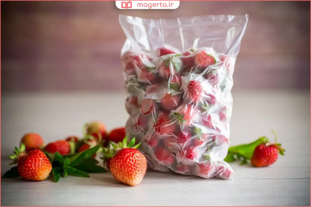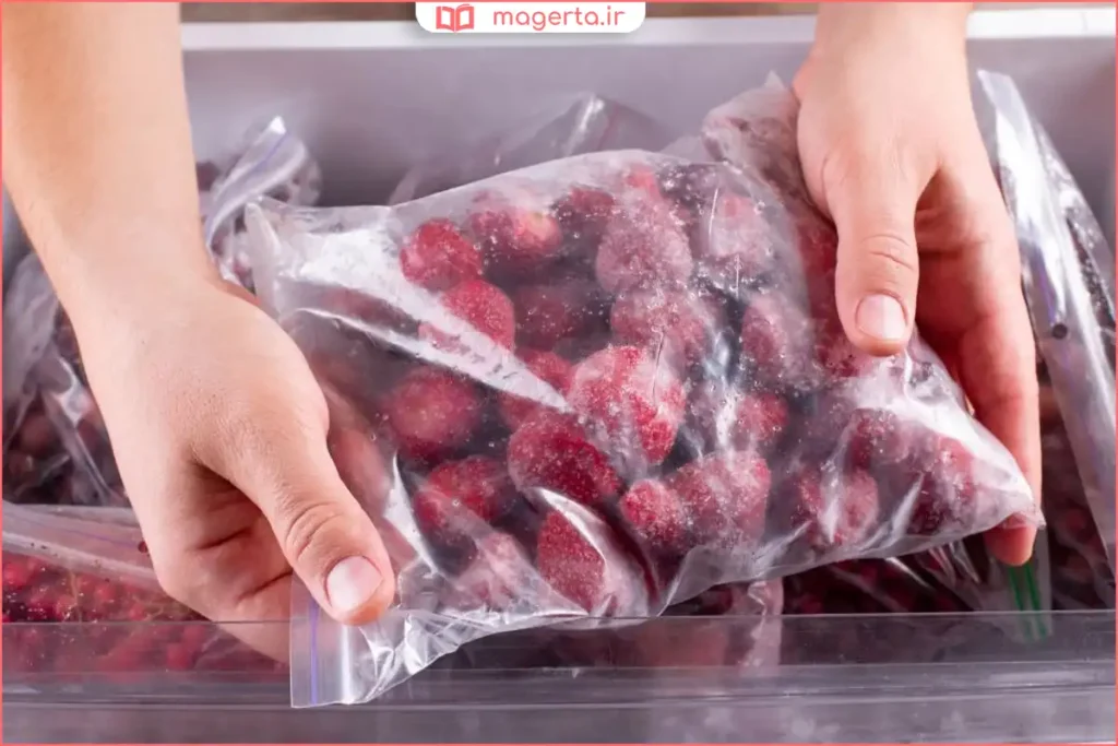 کیسه را در فریزر قرار دهید. با این روش توت‌فرنگی‌ها به هم نمی‌چسبند و هنگام استفاده به راحتی از هم جدا می‌شوند.