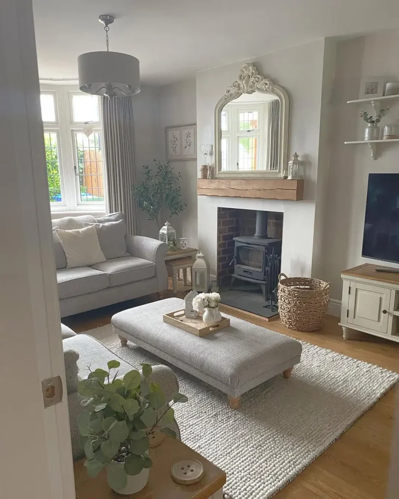 رنگها ملایم ولی غنیان: مبلمان خاکستریِ کبوترطور، میزهای چوب بلوطِ کهنهنما، پاف کتانی که آدم دلش میخواد پا برهنه روش لم بده. فانوسهای روی زمین و سبد هیزمها میگن اینجا برای زمستونهای طولانی ساخته شده؛ با جوراب پشمی، آتش، و حرفهایی که طول میکشن.