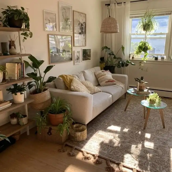 صندلیهای حصیری، گیاههای سبز با تُن زیتونی و نوری که روی فرش بافتدار میرقصه، یک دنجیِ خاص میسازه. حس فضا ترکیبی از بوهو شهری با رگههای دستساز و فرهنگیه. انگار اتاق میگه: «بیا تو، چای بریز، یه کم بمون.»