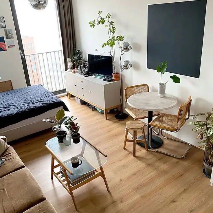 کوچیکه، ولی پرقدرت. اینجا ثابت میکنه متراژ هیچ ربطی به خوشسلیقگی نداره. رنگهای آجریِ ملایم، چوبهای گرم و یک گوشهی غذاخوری شیک کنار پنجره، باعث میشن این «پذیرایی-همهکاره» شبیه یک کافهی اروپاییِ جمعوجور بشه.