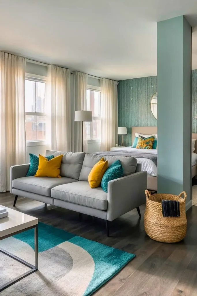 این اتاق مثل یک جعبهی جواهره که از رنگ پر شده. دیوارهای سبزآبیِ پررنگ، کوسنهای خردلی، آبی نیمهشب و طلاییِ مات، همه کنار هم یک درامِ خوشگل میسازن. فضا کوچیکه، ولی حسش مثل داخل یک صندوق مخملیِ گرونقیمته.