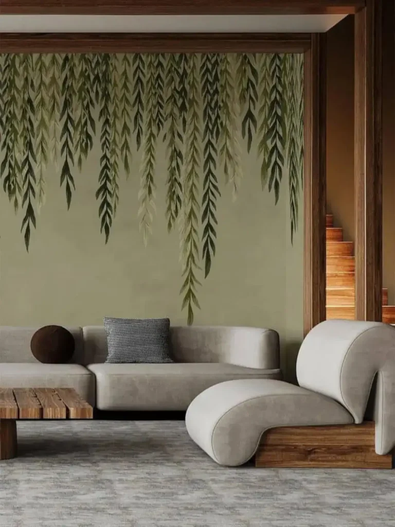 یک جنگل آروم، اما بازطراحیشده برای خانه. این فضا صندلیهای مجسمهگونه رو کنار کاغذ دیواری گیاهیِ آبشاری گذاشته که انگار سقف سبزِ طبیعت بالای سرت کشیده شده. سبز زیتونیِ عمیق و برگهای روان، یک آرامش غوطهورکننده میسازه؛ مثل حس اسپای دنج داخل یک خانه مدرن.
