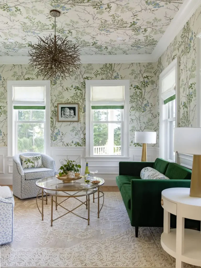 این همون لحظهایه که میگی “باشه، درام میخوام” و واقعاً تا سقف میری. کاغذ دیواریِ سرسبز حس یک فیلم تاریخی رو میده؛ انگار رفتی داخل یک داستان قدیمی، فقط با نور بهتر و یک مبل مخمل سبز.