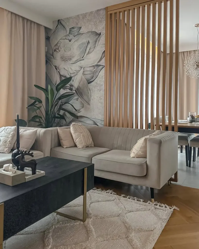 باروک، اما با رنگ بژ. این دیوار با نقشهای پیچکی قرار نیست داد بزنه؛ نرم و لغزنده حرکت میکنه. کنار یک مبل کرمیِ منحنی و کلی کوسن نرم، یک حس سالنِ شیکِ پاریسی میده، بدون اینکه تبدیل به فضاهای شلوغ و پرادا بشه.