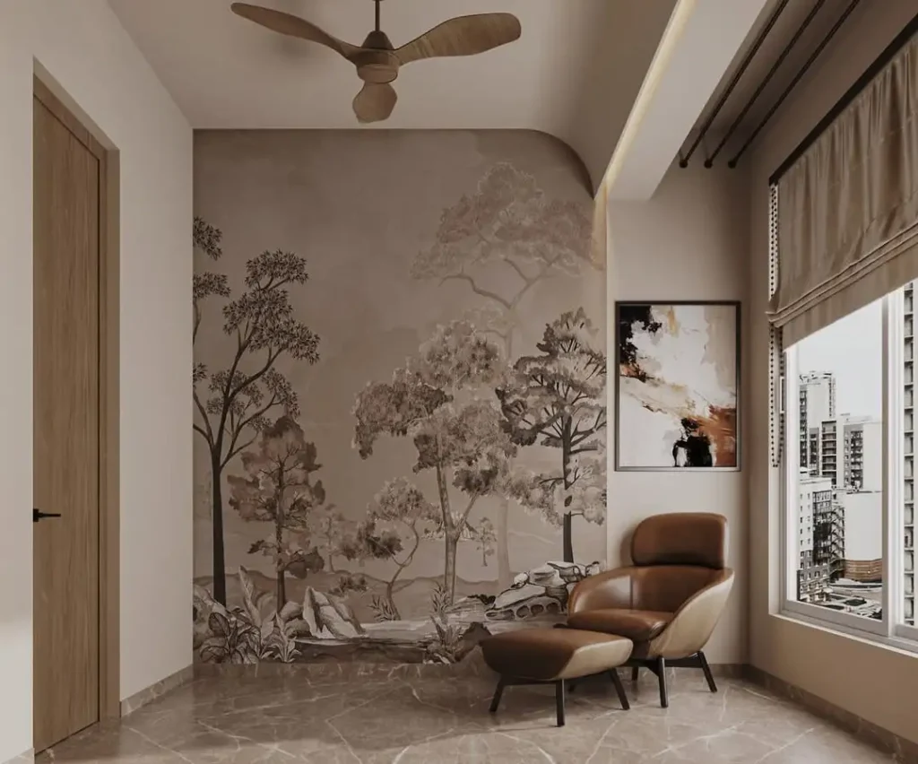 این فضا حس “مینیمالِ موزهای” داره، ولی نه از اون سردها. تصور کن نقشهای الهامگرفته از فرهنگها روی پسزمینهای شبیه رنگ چای. پنلهای دیواری قصه میگن و بقیهی اتاق با مبلمان سبک میانه قرن و رنگهای آرام، فقط حمایتش میکنه.