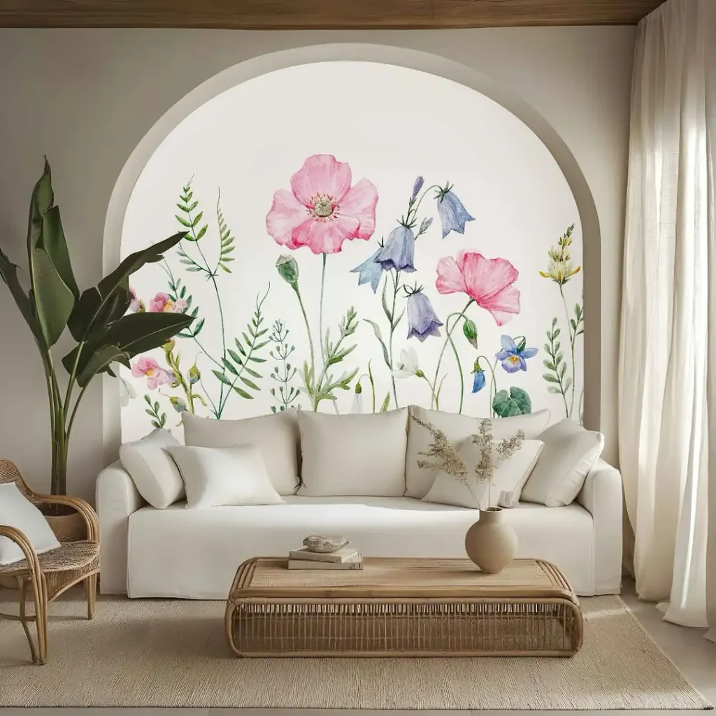 این دیوار انگار یک خواب آبرنگیه: سبزآبیِ محو، بژ نرم، و گلهایی که انگار نمکِ هوا لمسشون کرده. کنار مبل سفید بزرگ و یک فرش خیلی نرم، نتیجه میشه یک لحظهی “لوکسِ ساحلی” که داد نمیزنه، فقط آروم زمزمه میکنه.
