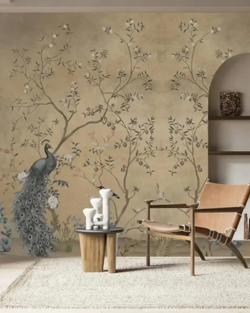 شیکِ شرقی با یک روح آزاد. طاووسها و شاخههای ظریف، یادآور دیوارنگارههای قدیمیان، ولی چیدمان ساده و رنگهای ملایم باعث میشن کاملاً امروزی به نظر بیاد.