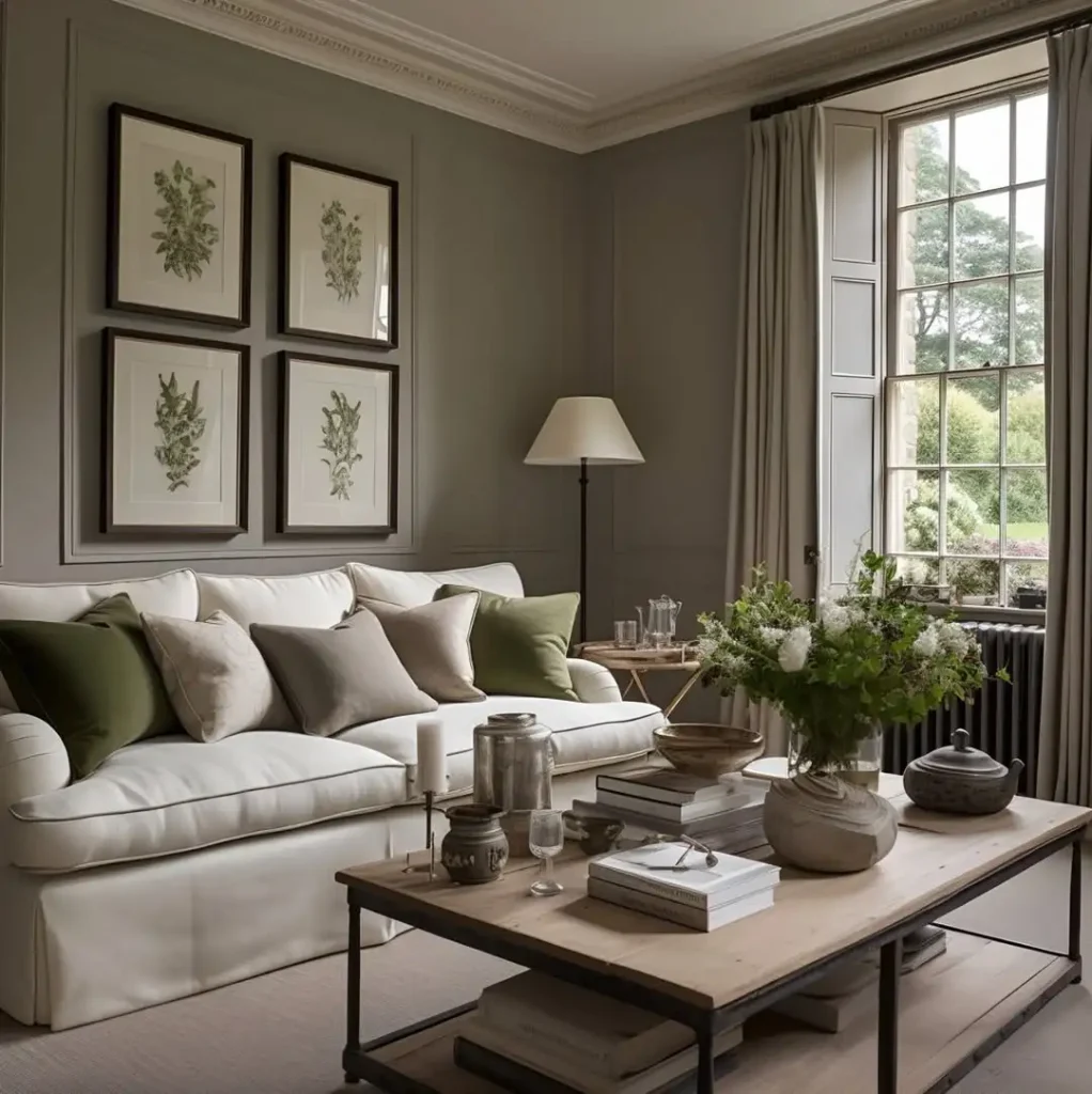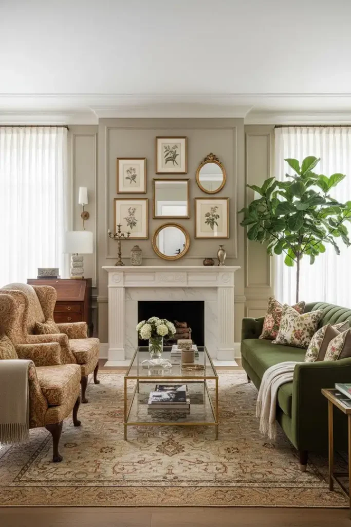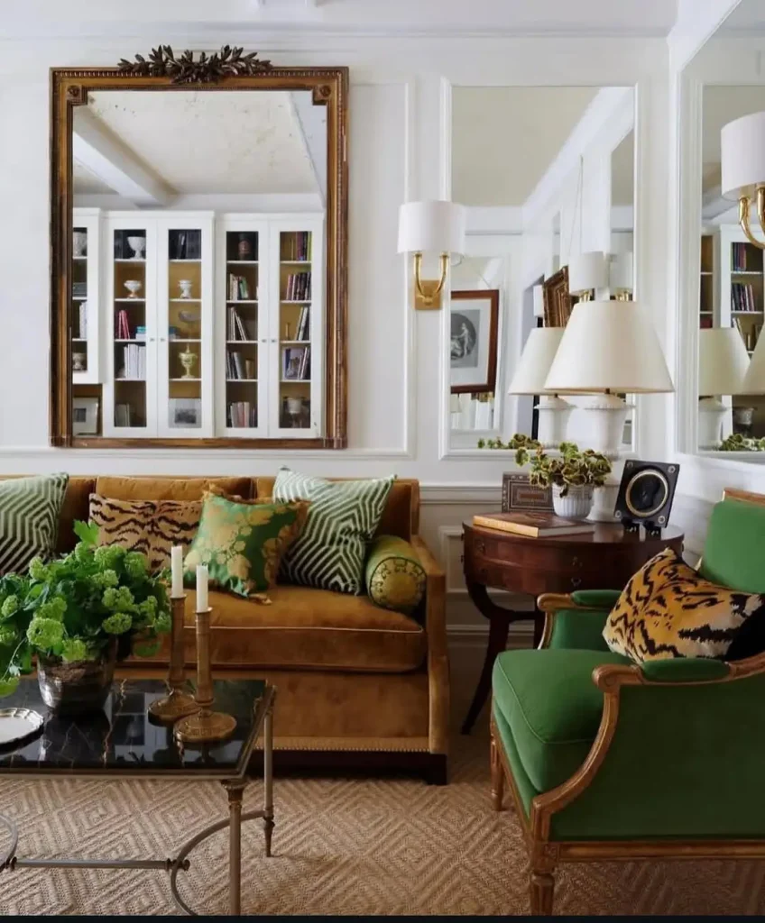 این فضا مثل یک نامه عاشقانه به طراحی قدیمی است. بوفه گردویی روی دیوار سبز تیره با اعتماد کامل کشیده شده و بالایش تابلوهای لایهدار قرار گرفتهاند؛ ترکیبی از جذابیت طرحهای کلاسیک و منظرههای نرم. فرش ملایم همه چیز را زمینی میکند و صندلی چرمی کاراملی همان گرمای لازم را اضافه میکند.