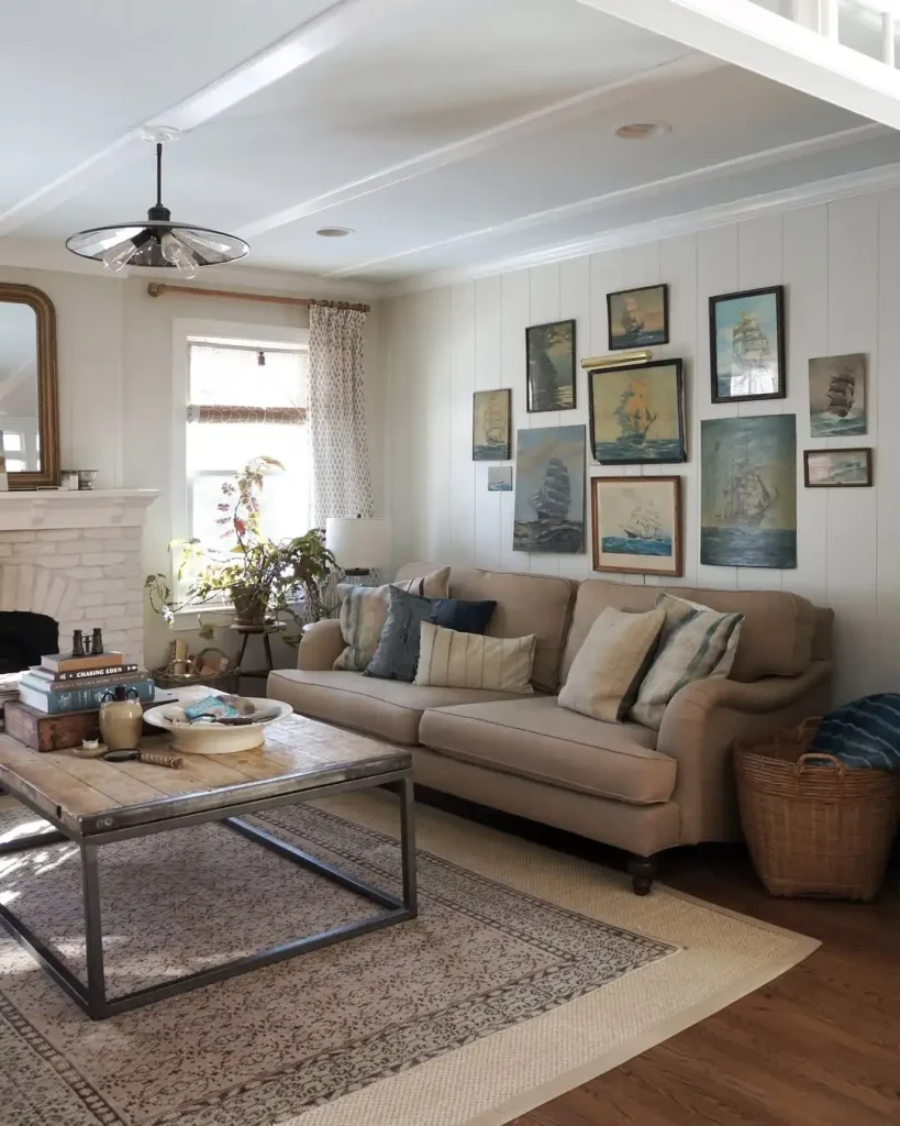 یک مبل بلند زیر یک دیوار گالری از تابلوهای قایقهای قدیمی؟ کاملاً بله. پارچه بژ روشن در طول فضا کشیده شده و فرشهای لایهلایهی کنفی و طرحدار نمیگذارند فضا تخت شود. دیوار گالری نگاه را به بالا میبرد و خطهای افقی را با یک حرکت عمودی قشنگ میشکند.