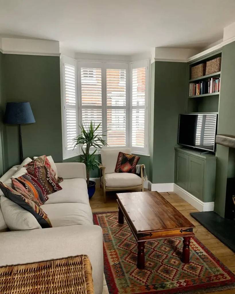 رنگ سبز غنی، به این پلان کشیده شخصیت میدهد. پنجره بیرونزده تبدیل میشود به یک گوشهی مخصوص خودتان، با نوری که از پشت شاترها میریزد داخل. قفسههای توکار هم تلویزیون را مرتب جا دادهاند، بدون اینکه مرکز توجه را بدزدند.