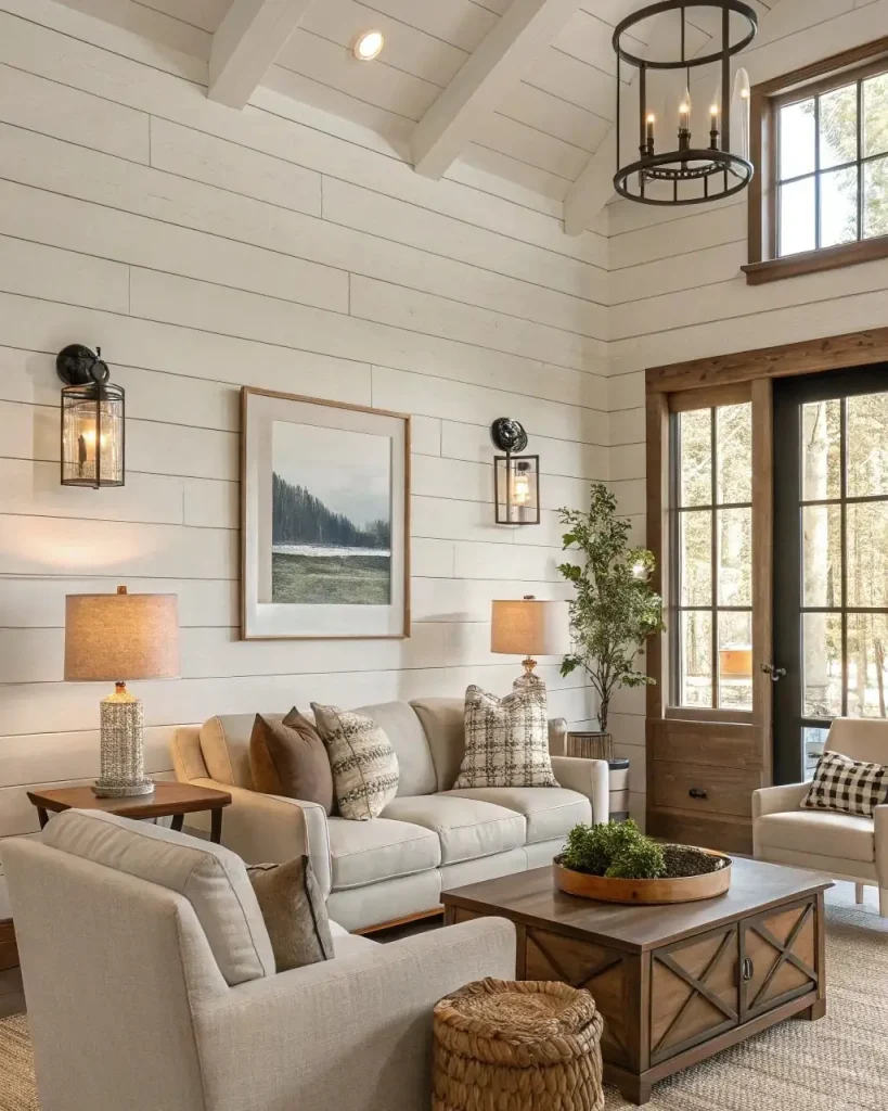 نورپردازی لایهای (آباژور و نورهای موضعی)، بافتهای گرم (چوب و پارچههای نرم)، و یک مرکز مشخص (میز/پاف) که آدمها را دور هم جمع کند.