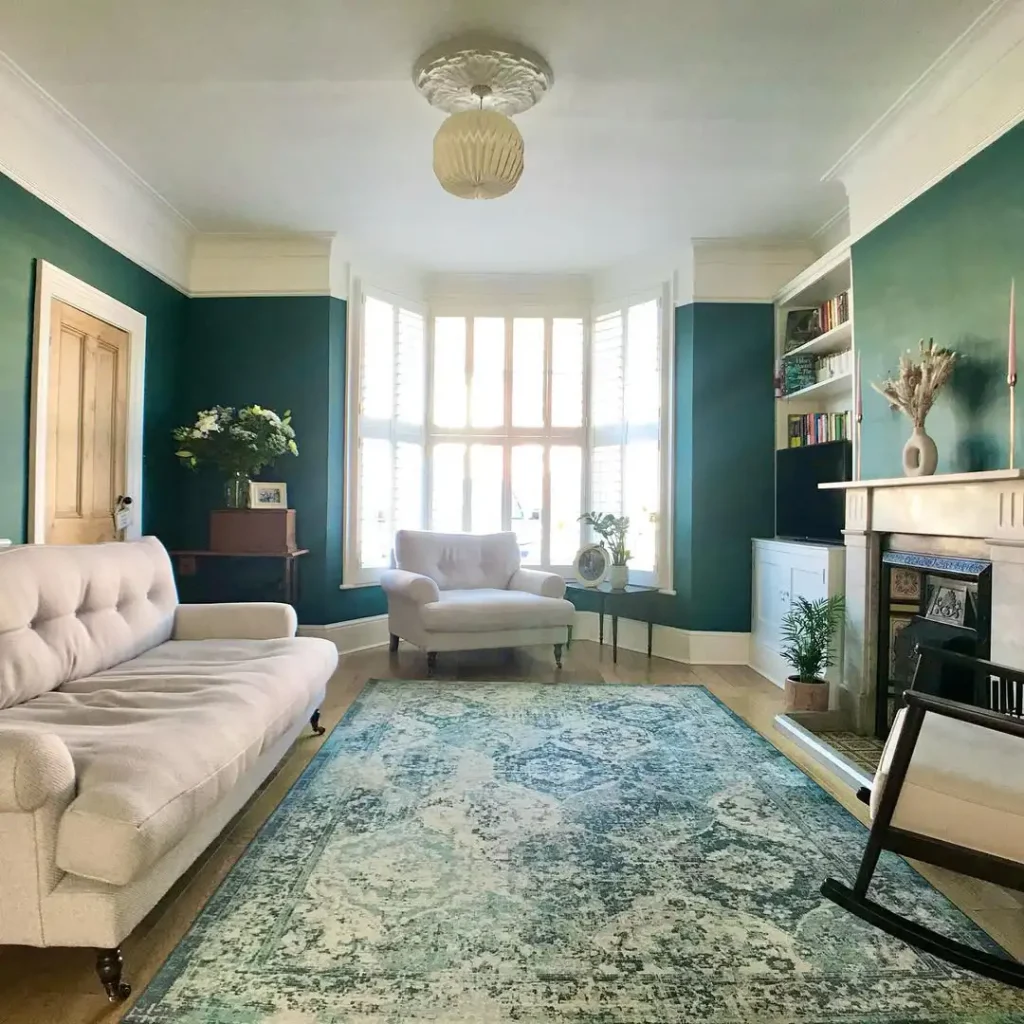 رنگ کردن دیوارها با سبز-آبیِ عمیق، این پذیرایی کشیده را هم دراماتیک میکند هم دنج. پنجره بیرونزده در انتهای فضا هم تبدیل میشود به نقطه کانونی و ناخودآگاه شما را به سمت خودش میکشد.