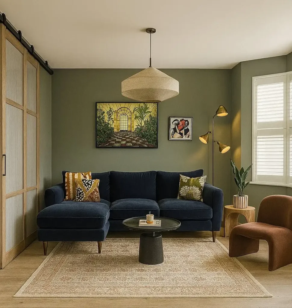 تقارن این فضا واقعاً دلچسب است. یک مبل الِ سرمهایِ تیره یک سمت پذیرایی را محکم نگه میدارد، در حالی که دیوارهای زیتونیِ ملایم در طول فضا کشیده شدهاند، بدون اینکه فضا را سنگین کنند. درِ ریلی چوبی هم بافت اضافه میکند و خیلی نرم مرز یک بخش را مشخص میکند، بدون اینکه پذیرایی را نصف کند.
