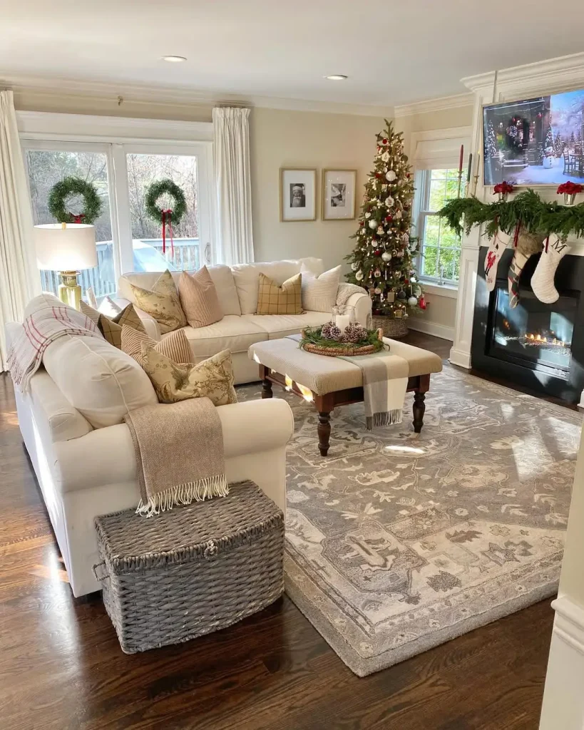 مبلهای سفید نرم، خنثیهای لایهلایه و حلقههای سبز با روبان مخملی؛ حالوهوای مناسبتی دارد، اما زیادهروی نمیکند. درخت نزدیک شومینه یک نقطه کانونی طبیعی میسازد و فرش خنثی هم همه چیز را یکدست نگه میدارد.