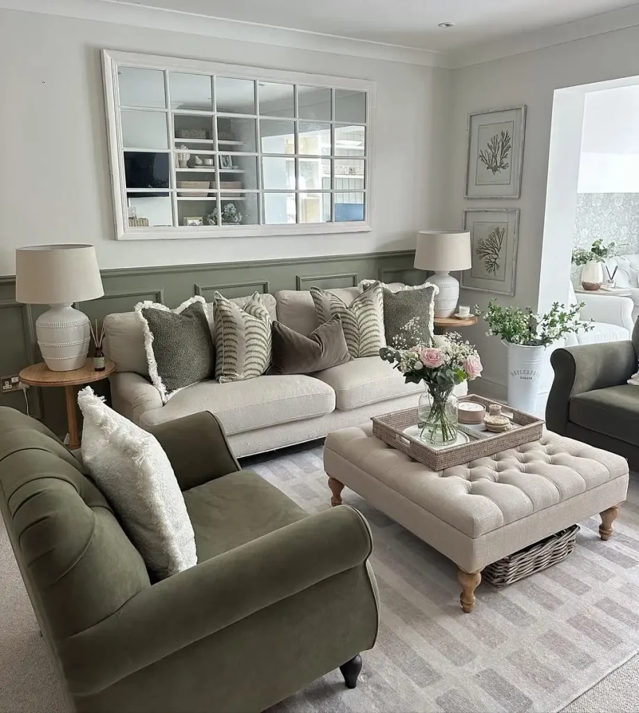 پنلهای دیواری و آن آینه بزرگ کنار پنجره دست به دست هم دادهاند تا پذیرایی از نظر بصری عریضتر دیده شود. دیوارهای پایین با رنگ سبز مریمگلی، فضا را نرم در آغوش میگیرند و مبل روشن با کوسنهای لایهدار، فضا را سبک و دوستداشتنی نگه میدارد.