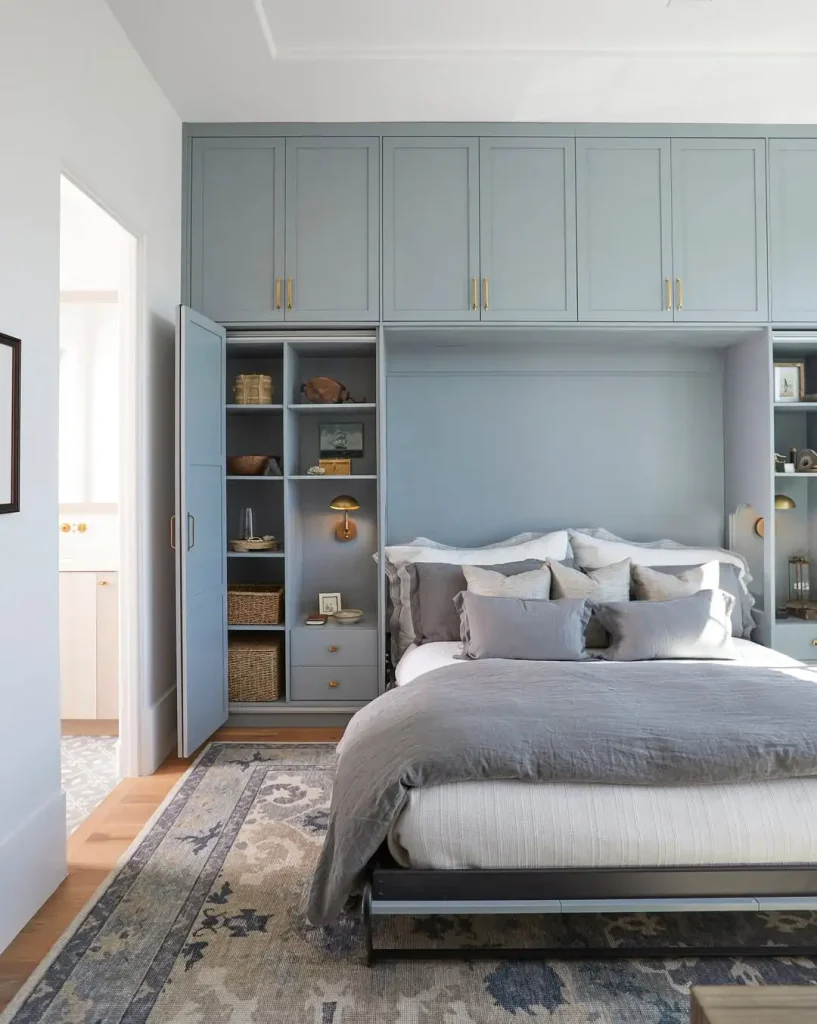 اینجا با یک تخت مورفی “بیروح” طرف نیستیم؛ این یکی شخصیت داره. تخت داخل یونیتهای آبیِ پودری با دستگیرههای طلایی و دیوارکوبهای برنجی جا گرفته و وقتی باز میشه، میافته وسط یک عالمه بالش کتانی و روتختی لایهلایهی طوسی. دنج هست، ولی همزمان خیلی مرتب و حسابشده هم هست.