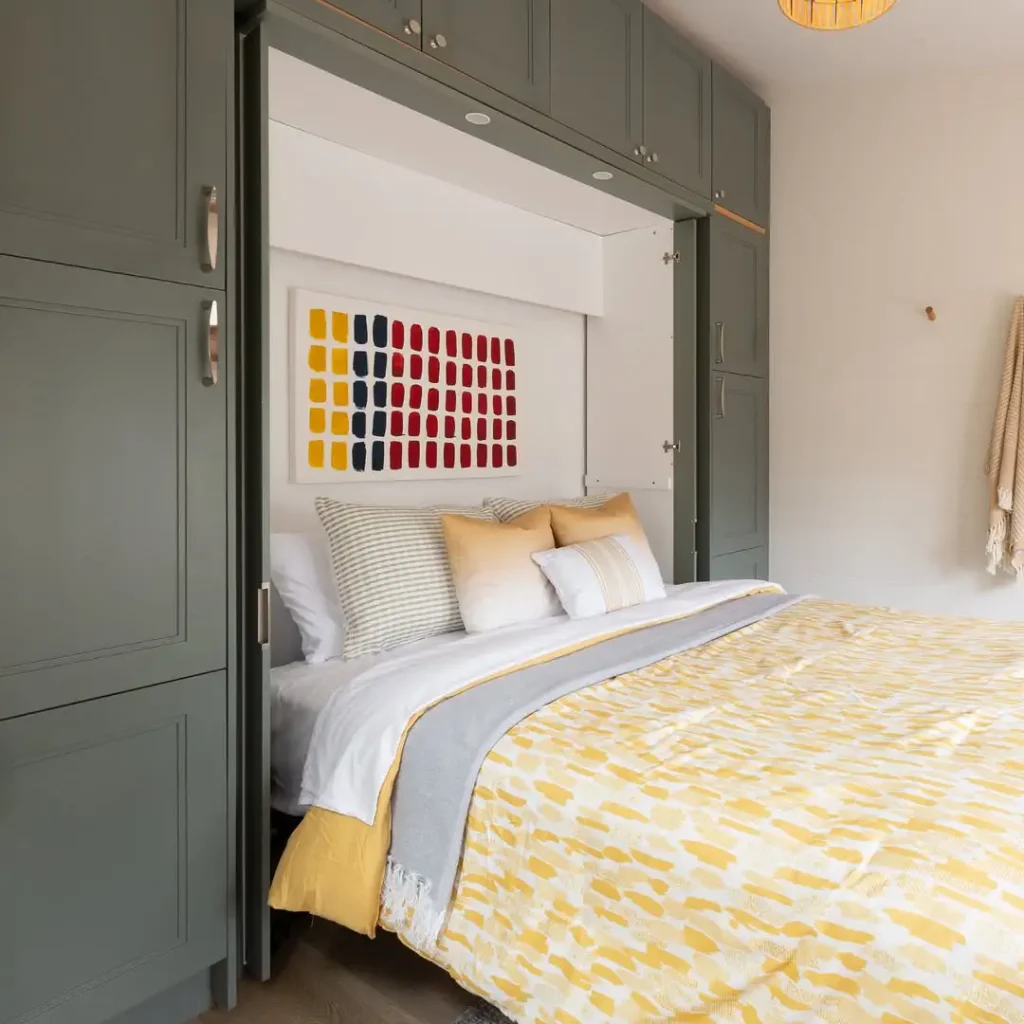 این یکی مثل آفتاب است. روتختی زرد خردلی روی کابینتهای سبز مریمگلی میترکد و تخت سفید مورفی هم مثل آب خوردن جمع میشود. تابلوی انتزاعی هم یک چشمک شیطنتآمیز به فضا میدهد.