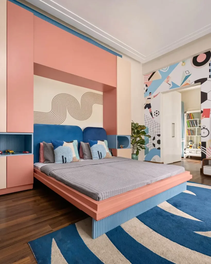 این فضا مثل یک سفر تفریحی برای چشمهاست: پاستلیهای تند، طرحهای گرافیکی، و تختی که انگار میتوانست توی یک فیلم وس اندرسون زندگی کند. هندسهی بازیگوش دیوار تاکید، به اتاق حرکت میدهد و ترکیب مرجانی و سرمهای هم اجازه نمیدهد همه چیز زیادی شیرین شود.