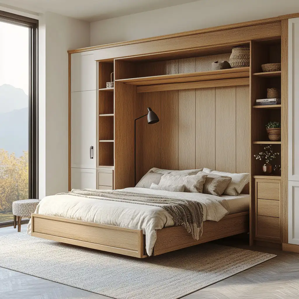 این مدل جوابِ تخت مورفی برای رویای مینیمالِ اسکاندیناویایی است. فینیش بلوط گرم، پنلهای عمودی و باکسهای باز، همان حس دنجیِ خلوتی را میدهند که خیلیها عاشقش هستند. روتختی شنیرنگ و منظرهی پنجره بزرگ هم همه چیز را کامل میکند.