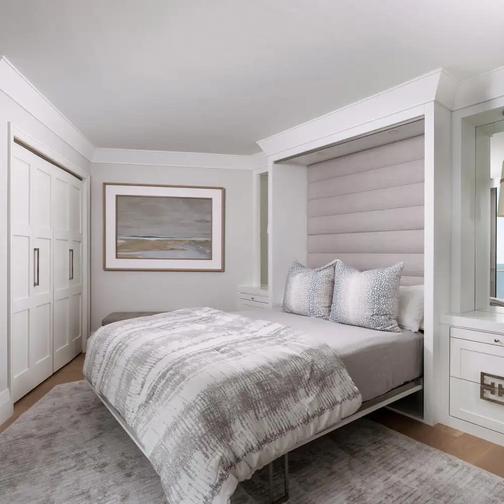 این تخت مورفی دقیقاً نمونهی طراحی فکرشده است. تناژهای خاکستری-آبی ملایم کنار کابینت سفید تمیز، یک بوم تازه و مرتب میسازد.