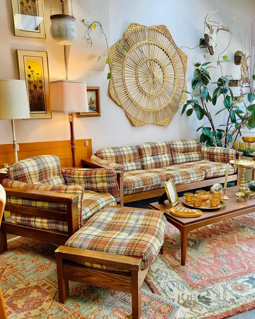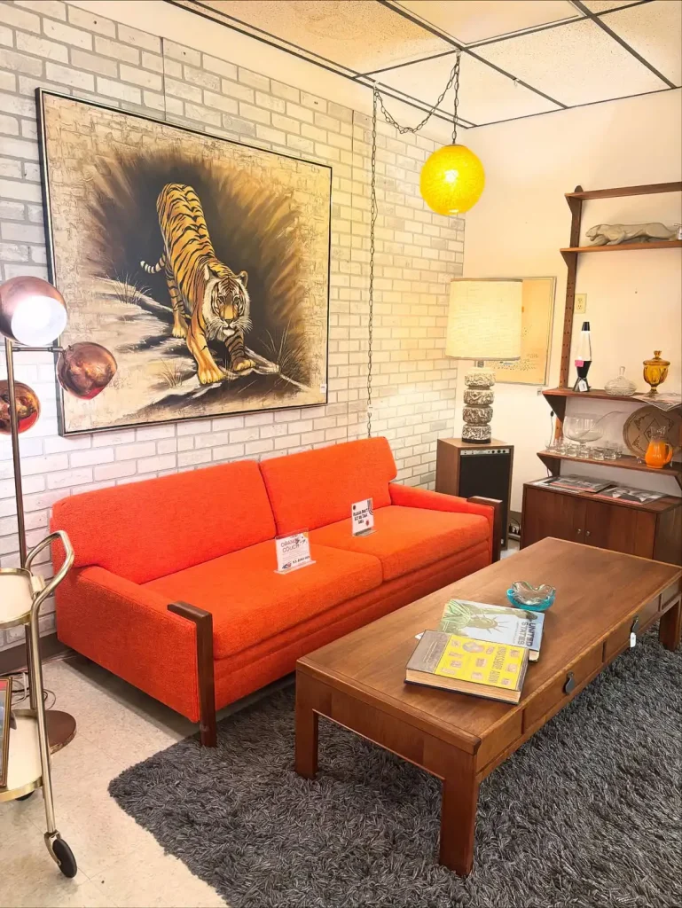 یک مبل نارنجی تویید زیر نقاشی ببر مخملی… این دیگر از آن صحنههای “وینتیجِ واقعی” است. چراغ گدازهای، چراغ آویز کروی، فرش پرزبلند… همه چیز همان حس شکار گنج در سمساری را دارد.