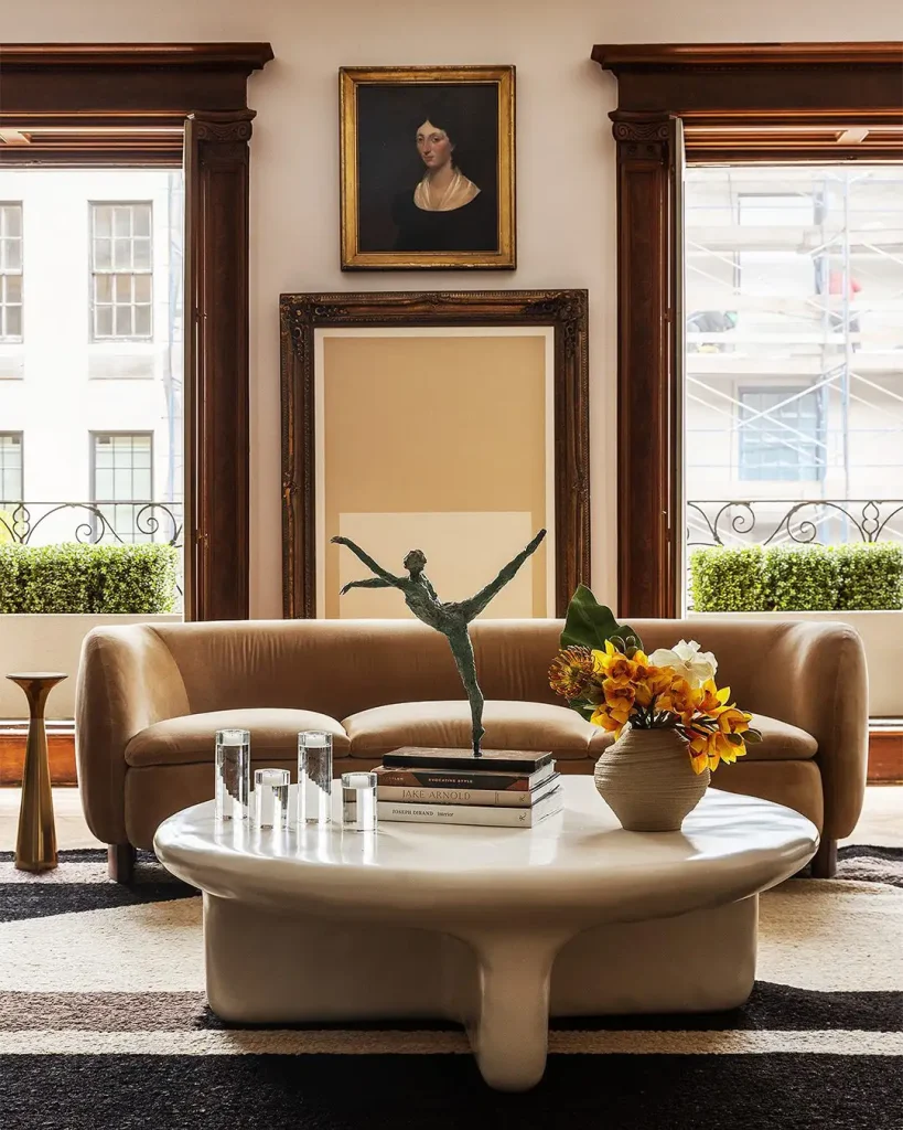 اینجا بوی “طراحی سطح بالا” میده. یک میز جلو مبلی مجسمهای با فرم نرم کنار مبل شتریرنگ و قابهای چوبی تیره، ترکیبی ساخته که هم رترو الهام گرفته، هم خیلی گالریطور چیده شده.