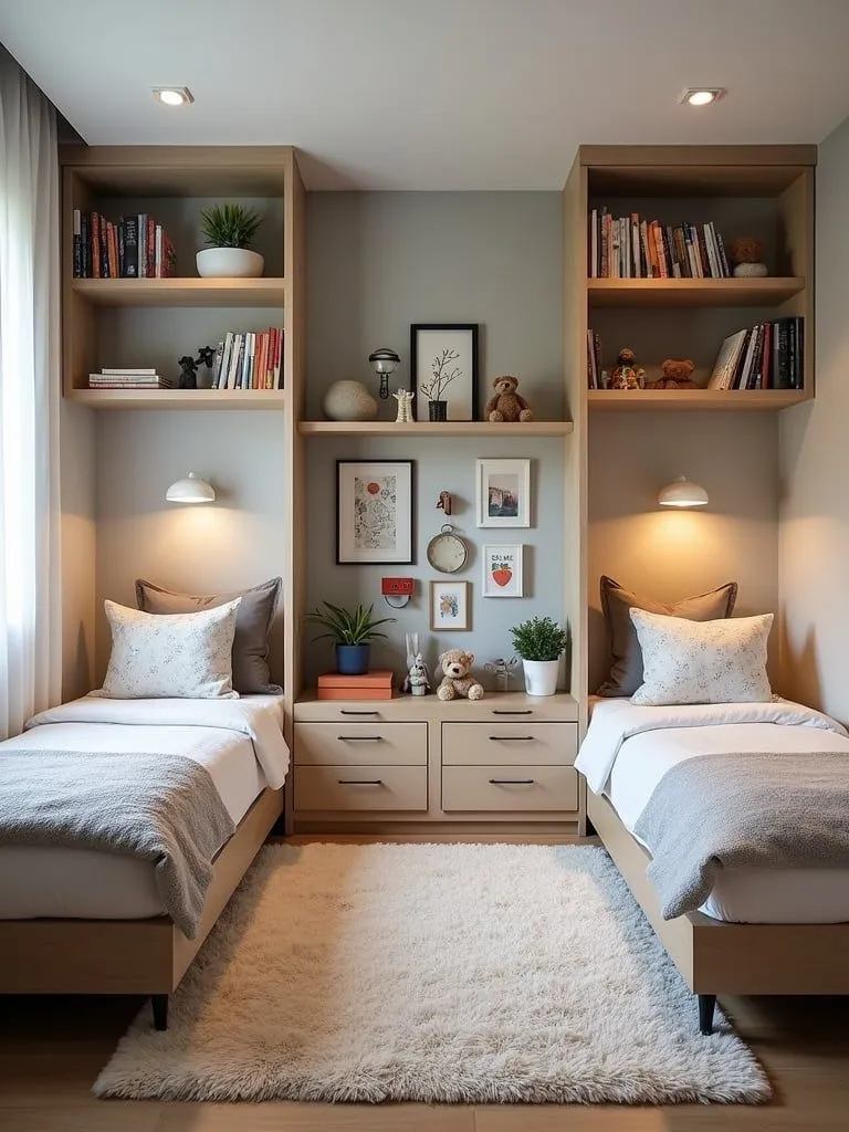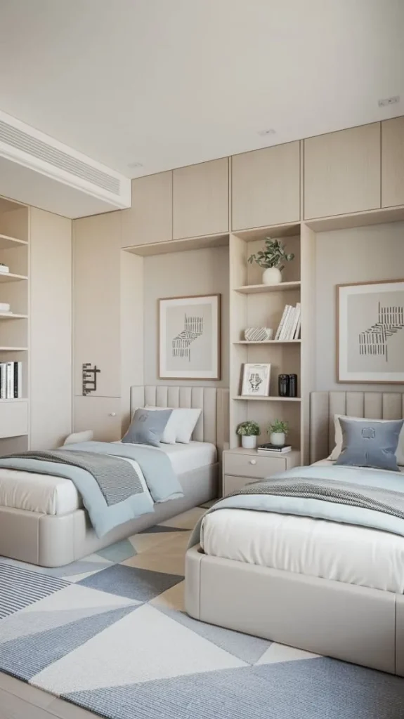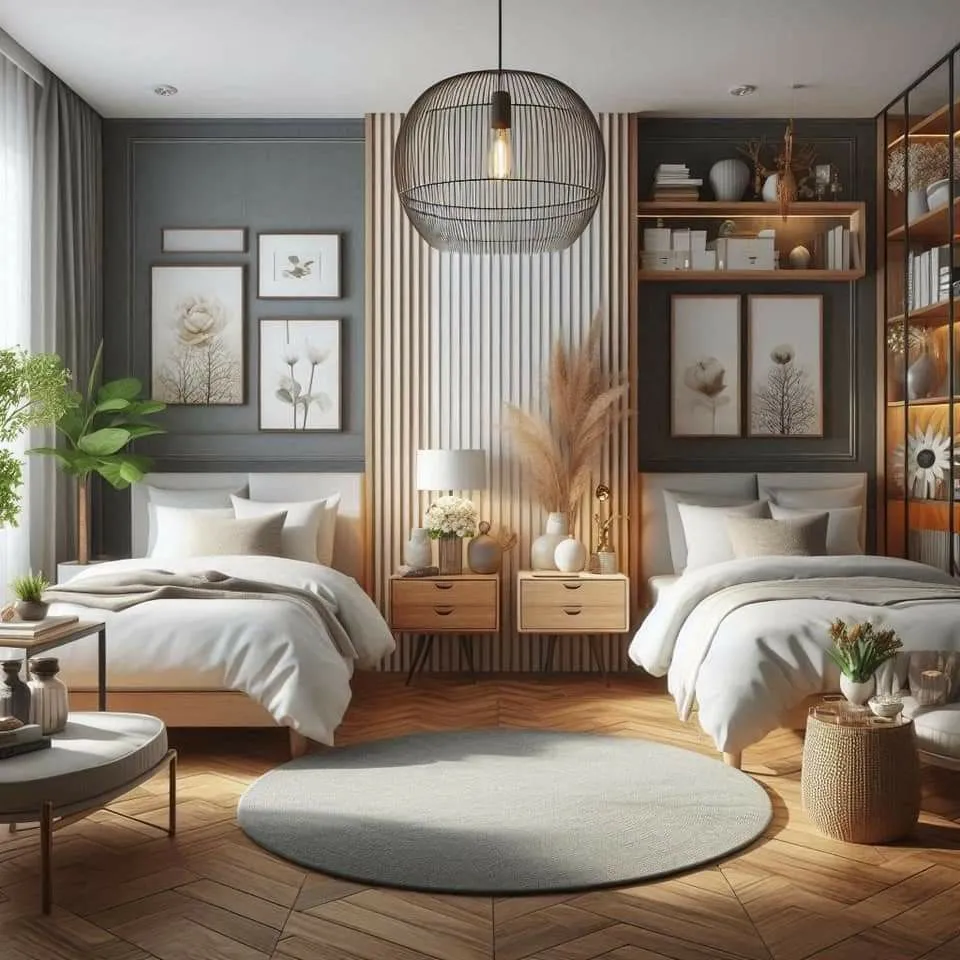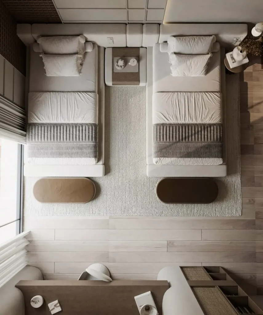 همچنین استفاده از میزهای مرکزی کوچک برای بازی مشترک یا طراحی کتابخانههای عمودی بین دو تخت، جلوهای هماهنگ و کاربردی به فضا میدهد.